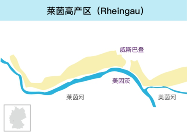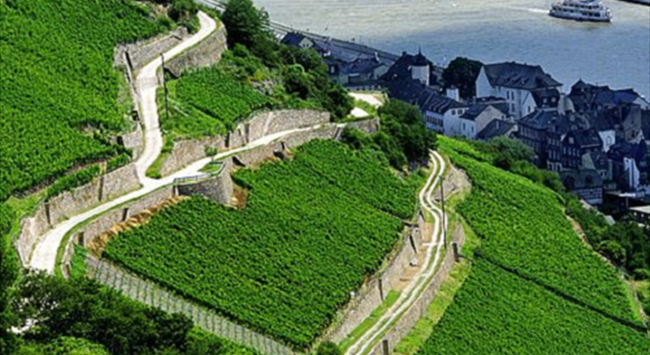 萊茵高是德國最小但最重要的葡萄酒產(chǎn)區(qū)之一,也是世界上知名的優(yōu)秀葡萄酒產(chǎn)區(qū)。萊茵高位于威斯巴登( Wiesbaden)和勞赫豪森(Lorchhausen)之間,整個產(chǎn)區(qū)沿萊茵河分布,由西而東地形從寬闊的平原逐漸變?yōu)槎盖偷男逼?,景色十分?yōu)美。