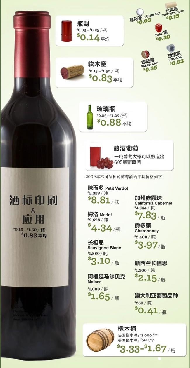 葡萄酒釀出來之后,在到達消費者手中之前,還必須經(jīng)過包裝、運輸和分銷等過程。葡萄酒的包裝費用包括酒瓶、瓶塞、瓶封、酒標(biāo)和箱子等。不同的瓶塞價格各不相同,比如軟木塞的平均費用是0.83美元/個,而螺旋塞的費用要低不少,只要0.35美元/個。一個玻璃酒瓶需要0.88美元左右……不同的生產(chǎn)商可能采用不同的方式把自己的葡萄酒推上市場,不過,不管選用哪種方式,都需要支付一定的分銷成本。