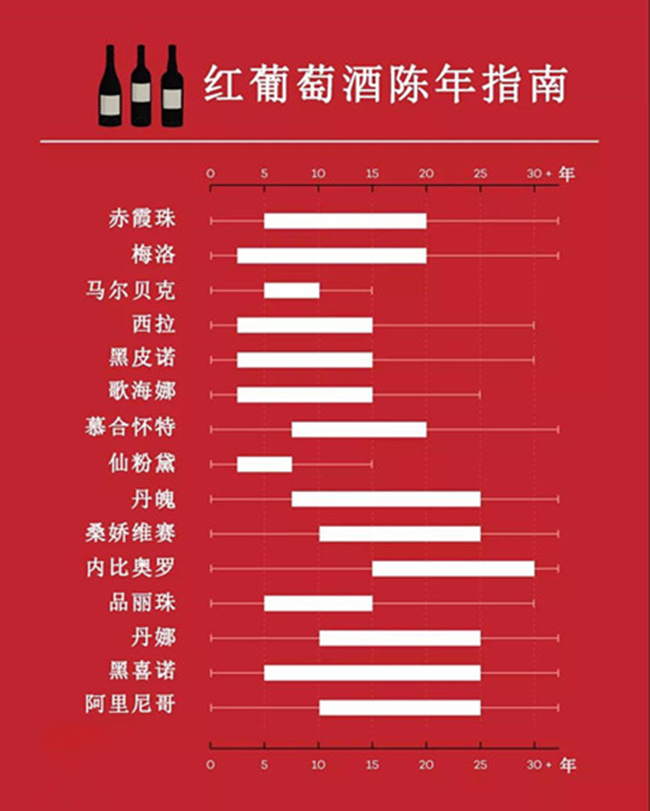 以上紅葡萄酒的陳年影響因素與葡萄品種本身有很大的關(guān)系,以下是一個(gè)簡(jiǎn)潔版的紅葡萄品種的陳年指南,僅供參考: