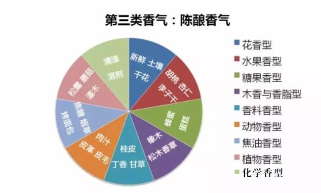 三類香氣是指葡萄酒在陳釀過程中所發展出來的香氣。當葡萄酒被長時間保存在橡木桶中時,陳釀過程的氧化作用會給葡萄酒增加如咖啡、太妃糖、焦糖等第三類香氣。而當葡萄酒被長時間保存在酒瓶中時,雖說不再有氧化反應,但也會發展出如汽油、蜂蜜、蘑菇等第三類香氣。在這個過程中,葡萄酒中的一、二類香氣會與微量的氧氣接觸發生氧化反應,發展出動物皮革、蘑菇、煙草和森林地表等氣息。而清新的果香也會演化成果醬的味道。這些香氣是一些老年份葡萄酒帶給我們的美好享受。