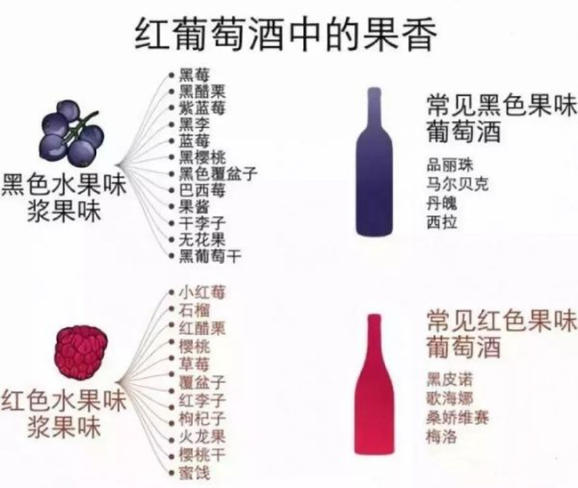黑色水果的香氣常見于赤霞珠和西拉等葡萄酒,香甜中多了一分深邃,在最成熟的葡萄酒中會發展為果醬的香氣。