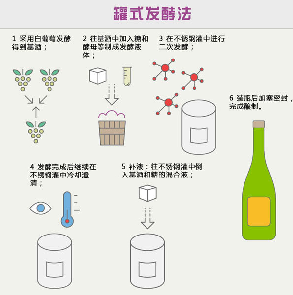罐式發酵法最大的優點就是成本低,耗時少,節省勞動力,目前世界上大多價格實惠的起泡酒都采用罐式發酵法釀制。這種起泡酒一般口感簡單,香氣明顯。不過,由于沒有進行酒渣陳釀,少了酵母帶來的復雜風味,因此嘗起來就像靜止葡萄酒中加入了氣泡一樣