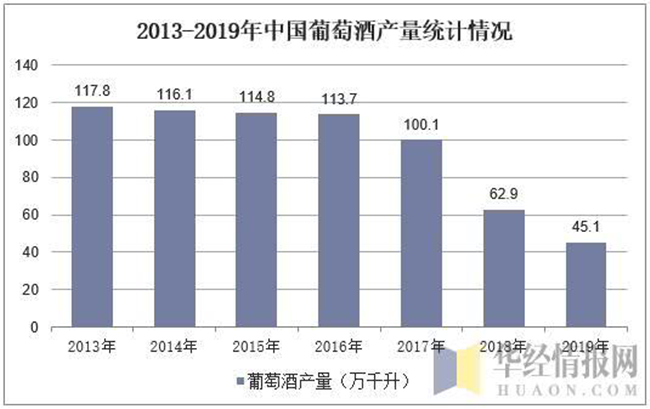 然而,目前中國(guó)的葡萄酒產(chǎn)業(yè)發(fā)展并不成熟,隨著我國(guó)國(guó)民生活質(zhì)量的提高,對(duì)高端葡萄酒需求增加,進(jìn)口葡萄酒快速蠶食國(guó)產(chǎn)葡萄酒市場(chǎng)份額,近年來中國(guó)葡萄酒產(chǎn)量持續(xù)下降,2019年中國(guó)葡萄酒產(chǎn)量達(dá)45.1萬千升,與2018年相比減少了17.8萬千升。