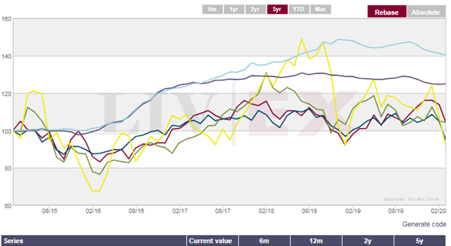 不論短期和長期(5年),行業(yè)基準(zhǔn)的Liv-ex 100指數(shù)和最廣泛市場指標(biāo)的Liv-ex 1000指數(shù)的表現(xiàn)均優(yōu)于全球股票(和石油!)。 在過去五年,Liv-ex 1000指數(shù)已上升了40%,而FTSE100指數(shù)卻下跌了5%。