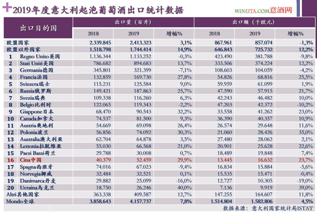 近日,意大利農業(yè)和食品市場研究中心(ISMEA)發(fā)布《2019年度意大利起泡酒出口報告》。根據(jù)意大利國家統(tǒng)計局(ISTAT)的統(tǒng)計數(shù)據(jù),2019年意大利起泡酒出口量超過415萬百升,同比2018年增長7.8%。出口額為15.828億歐元,同比2018年增長4.5%。意大利起泡酒出口額的增長速度高于同時期意大利葡萄酒的整體出口額增速(3.2%),是意大利葡萄酒出口增長的有力引擎。