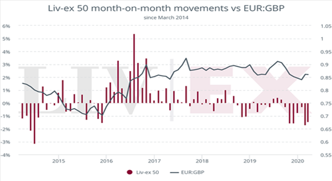 在整個2017年度,Liv-ex 50(見下文)對歐元兌英鎊匯率非常敏感;隨歐元的升跌而變化。 在2018年度,價格因匯率穩(wěn)定也變得相對平穩(wěn)。在2019年夏季,英鎊由于Theresa May被迫辭職而疲軟,美元和歐元買家再次把握入市。然而,在英國大選前夕及美國對歐洲葡萄酒征收關稅等因素的影響下,英鎊快速走強,令市場(Liv-ex 50)在最后一個季度走軟。