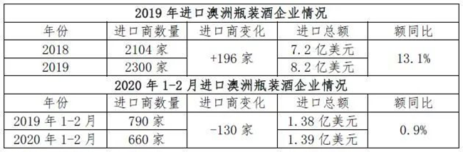 從上表數(shù)據(jù)可以看出,近兩年進(jìn)口澳洲葡萄酒企業(yè)數(shù)量持續(xù)增長,說明澳洲酒在華市場(chǎng)越來越受到進(jìn)口商的青睞。受疫情對(duì)行業(yè)的影響,今年1-2月較之去年同期進(jìn)口商數(shù)量有所減少,但進(jìn)口額逆勢(shì)上行,在眾多供應(yīng)國中表現(xiàn)十分搶眼。