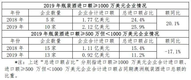 近兩年,頭部企業(yè)對(duì)澳洲酒的持續(xù)加碼對(duì)進(jìn)口葡萄酒市場(chǎng)格局起到了頭雁效應(yīng)。澳洲瓶裝酒進(jìn)口頭部企業(yè)(指進(jìn)口額≥500萬美元以上的企業(yè))隊(duì)伍有所壯大,且進(jìn)口額呈正向增長(5.6%):其中,2019年進(jìn)口額≥1000萬美元的10家企業(yè)中9家實(shí)現(xiàn)同比增長,僅1家同比下降;進(jìn)口額≥500萬美元的13家企業(yè)中9家實(shí)現(xiàn)同比增長,4家同比下降。