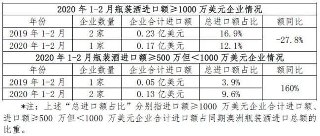 今年1-2月,盡管疫情對(duì)行業(yè)有一定沖擊,但澳洲瓶裝酒進(jìn)口頭部企業(yè)基本穩(wěn)住陣腳。雖然進(jìn)口額≥1000萬美元的企業(yè)僅1家,少于去年同期,但其進(jìn)口額同比增長近30%;而進(jìn)口額≥500萬但小于1000萬美元的企業(yè)有2家,數(shù)量增加,其中,1家進(jìn)口額實(shí)現(xiàn)倍數(shù)增長,1家為新的行業(yè)進(jìn)入者。