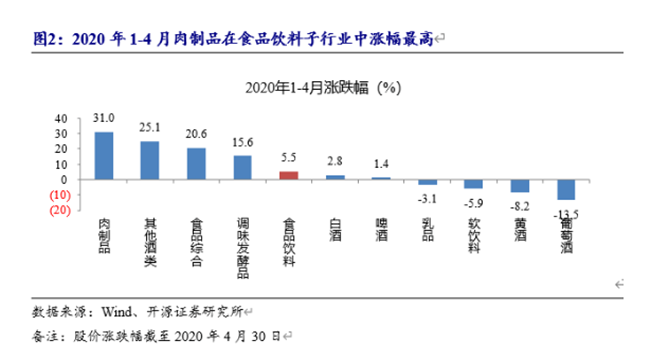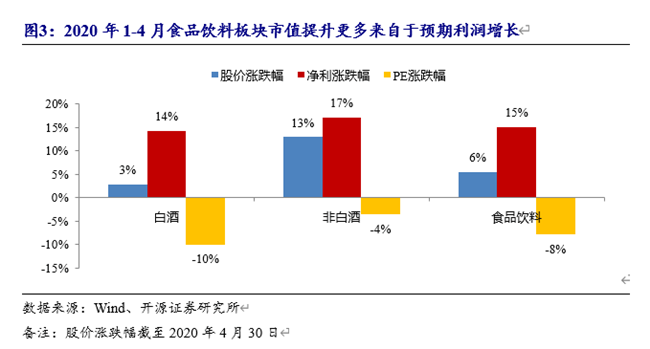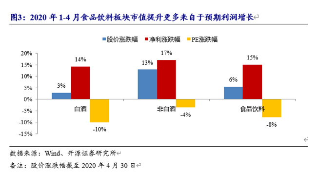 2020年1-4月食品飲料板塊上漲5.5%,在一級子行業中排名第三。漲幅分解來看,預計2020年凈利增長15%。