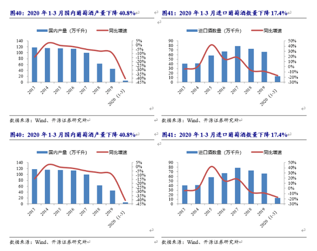 觀察行業數據,2020年1-3月國內葡萄酒產量同比降40.8%,降幅較年初擴大;進口酒量同比下滑17.4%,同樣加速下滑。