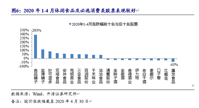 疫情期間消費場景發生變化,封城、封路、居家隔離使得消費者更多集中在家庭消費,具有居家囤貨需求的必選消費以及具備“宅文化”屬性的休閑食品表現較好。其中,葡萄酒品類中的通葡股份有著較突出表現。