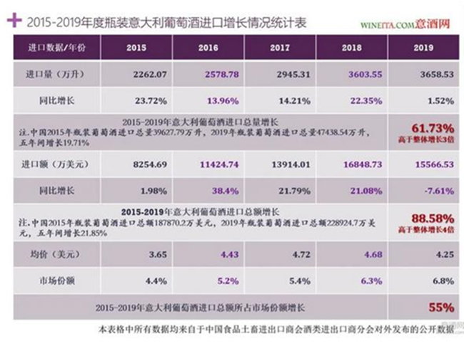 “與美國、加拿大等成熟市場相比,中國為代表新興市場的數據變化更能說明意大利葡萄酒逆勢上揚的現象,”意酒網負責人宮照馥分析稱,“從近幾年的數據來看,2015-2018年,中國市場瓶裝意大利葡萄酒進口總額連續四年增長,只有2019年度相比2018年度下降7.61%。五年間,瓶裝意大利葡萄酒進口總額從2015年的8254.9萬美元,增長至2019年的1.5566億美元,五年間增長88.58%,進口額增長率是同期中國市場瓶裝葡萄酒進口總額增長率的4倍。而從市場份額角度衡量,2015-2019年,中國市場瓶裝意大利葡萄酒進口額所占市場份額,實現連續五年增長,從2015年的4.4%的市場份額,增長至2019年的6.8%的市場份額。我的預測是,按照現有的五年市場份額增速55%,意大利的市場份額將增加到10.54%。”