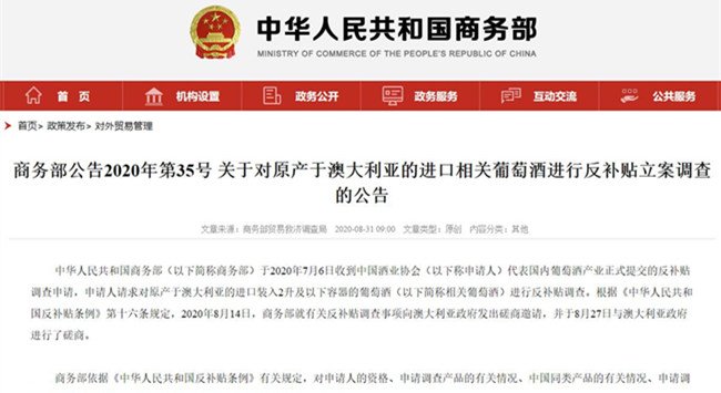 根據上述審查結果,依據《中華人民共和國反補貼條例》第十六條的規定,商務部決定自2020年8月31日起對原產于澳大利亞的進口相關葡萄酒進行反補貼立案調查。現將有關事項公告如下: