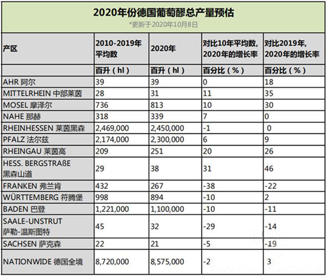 在德國全境范圍內(nèi),目前預(yù)計(jì)2020年的總產(chǎn)量約為8.6億升,接近10年來平均8.7億升的總產(chǎn)量,將比2019年的總產(chǎn)量高出3%。