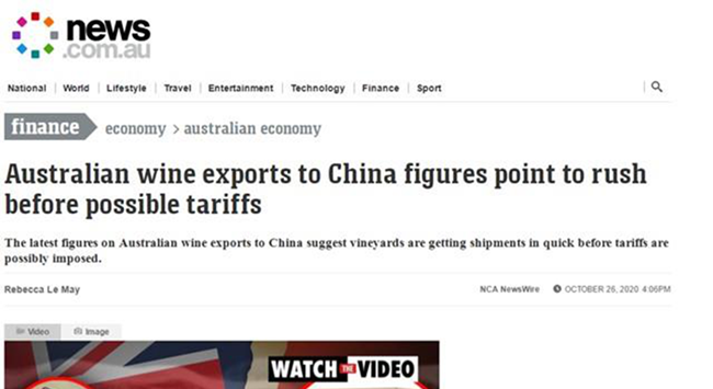 澳新網(wǎng)報道,根據(jù)澳洲葡萄酒機構(gòu)(WA),2019年9月至2020年9月,澳洲出口至中國(包括中國香港、澳門地區(qū))的葡萄酒價值達到了創(chuàng)造紀錄的125億元。