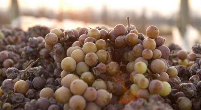 并不是每個(gè)年份都能生產(chǎn)冰酒,它精致的香味來(lái)自于風(fēng)味高度濃縮的葡萄果實(shí)。當(dāng)溫度低于零度,葡萄顆粒中的水會(huì)自然結(jié)冰,而在低溫的壓榨過(guò)程中冰不會(huì)融化,留在壓榨機(jī)內(nèi),這使得壓榨所得的葡萄果汁的含水量低、含糖量高,因此會(huì)像蜂蜜一樣濃郁甜美。由于酵母在高糖環(huán)境下的工作效率低,果汁中的糖分無(wú)法完全發(fā)酵成為酒精,因此冰酒的酒精度較低。