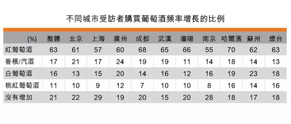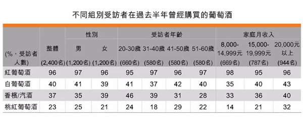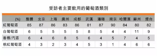 這次調查把葡萄酒分為四大類別:紅葡萄酒、白葡萄酒、桃紅葡萄酒及香檳及起泡酒。數(shù)據(jù)顯示: