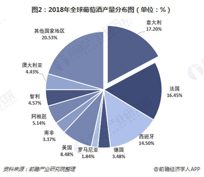分區(qū)域看,2018年意大利以48.5億升的產量再次成為世界葡萄酒最大生產國,占據了全球17.2%的葡萄酒生產市場;法國以46.4億升緊隨其后,占全球比重16.45%;西班牙產量40.9億升,排名第三。另外,阿根廷經過兩年產量低谷后,在2018年表現(xiàn)亮眼,產量較上年增長23%,達到14.5億升,躋身全球第五。