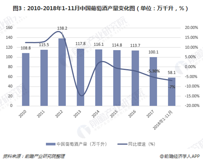 我國葡萄酒產量從2012年達到138.2萬千升的歷史高峰開始,一直在緩慢連續(xù)滑坡。根據國家統(tǒng)計局數據,2017年,全國葡萄酒產量100.1萬千升,累計下降5.3%;2018年1-11月,全國葡萄酒產量達58.1萬千升,累計下滑7%,若要趕超上年產量,12月的產量至少要達到42萬千升,而此數字比2018年前8個月的產量之和還多。結合目前數據看來,2018年國產葡萄酒產量大幅下滑已成定勢。
