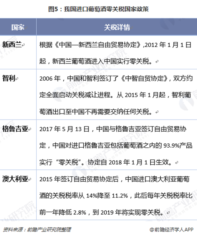 我國分別于2012年和2015年先后對新西蘭和智利進口葡萄酒實施零關稅,僅需繳納消費稅10%和增值稅16%。2018年起格魯吉亞進口葡萄酒也加入零關稅隊伍。根據中澳自貿協(xié)定,至2019年,我國進口澳大利亞葡萄酒的關稅將逐年降至零。關稅下行,不僅刺激著中國進口葡萄酒市場的發(fā)展,使進口葡萄酒的競爭進入白熱化階段,對中國國產葡萄酒市場份額的擠壓也是無可避免。