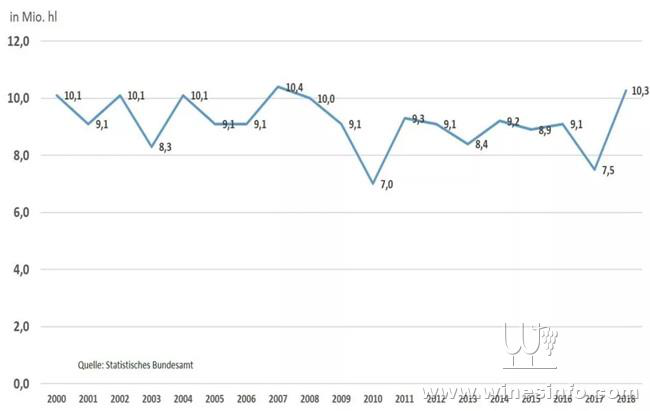 2018年德國葡萄酒的全國產量達到10.27億升。這個數值略低于2018年10月發(fā)布的10.67億升估計值。最新數據由德國葡萄酒協(xié)會(DWI)根據聯邦統(tǒng)計局的最終收獲結果予以發(fā)布。