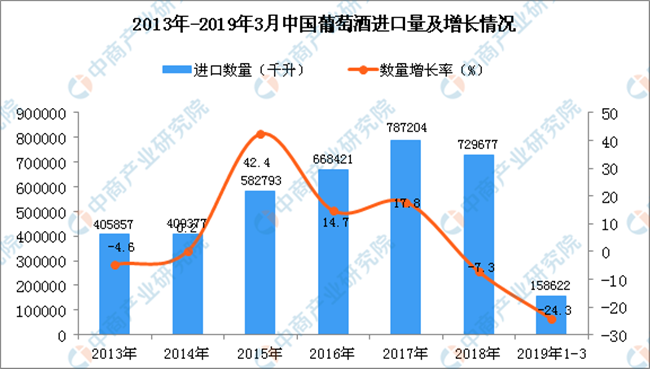 據中商產業研究院數據庫顯示,2013年-2017年中國葡萄酒進口量增長,共增長381347千升,增長93.96%;2018年中國葡萄酒進口量回落,2019年1-3月中國葡萄酒進口量為158622千升,同比下降24.3%。