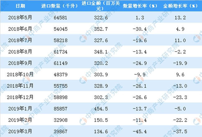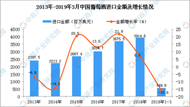 • 2019年3月中國葡萄酒進口量及金額增長情況分析