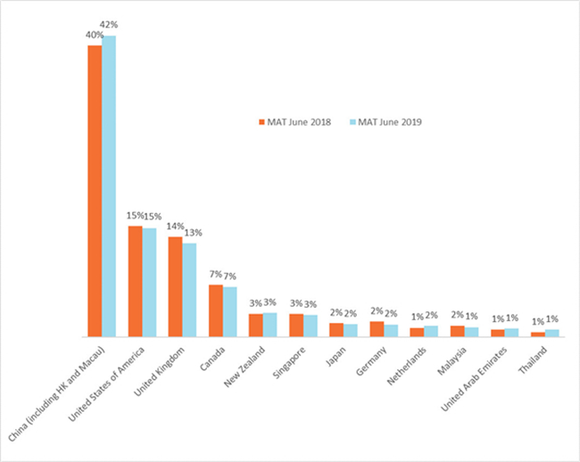 澳大利亞葡萄酒在中國(guó)表現(xiàn)非常良好。回顧2019年的前5個(gè)月,澳大利亞在進(jìn)口額上成為中國(guó)大陸排名第一的葡萄酒進(jìn)口來(lái)源國(guó)。同時(shí),在全球葡萄酒進(jìn)口市場(chǎng)總量下挫22%的情況下,澳大利亞葡萄酒在中國(guó)大陸的表現(xiàn)依然強(qiáng)勢(shì),其市場(chǎng)份額相比于2015年增長(zhǎng)了13%,達(dá)到了進(jìn)口總量的24%。澳大利亞鞏固了其作為中國(guó)市場(chǎng)優(yōu)質(zhì)葡萄酒主要供應(yīng)商的顯赫地位。