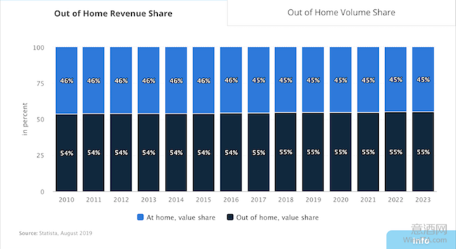 據統計,目前全球在家庭中日常消費的葡萄酒數量占葡萄酒總消費量的71%,而消費金額僅占全球葡萄酒總銷售額的45%。這也說明,餐廳、酒吧、體驗式門店(Enoteca)等渠道中對于葡萄酒銷售而言意味著更大的利潤空間。
