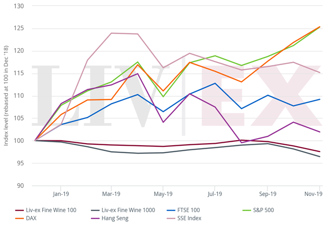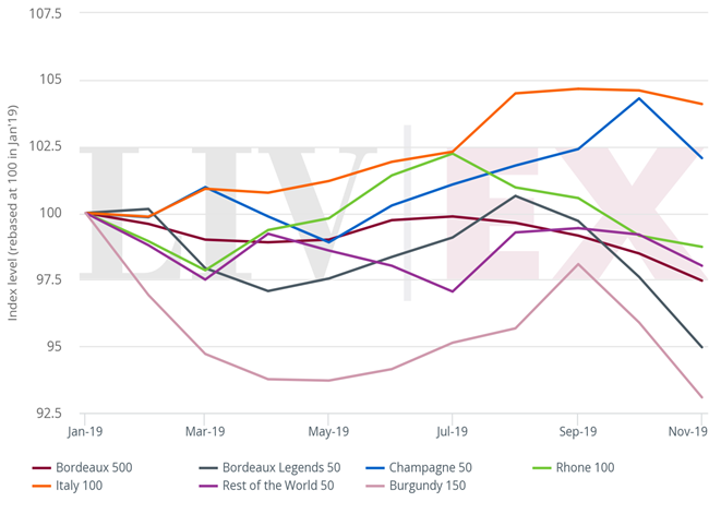 在2019年度持續的政治和經濟阻力下,Liv-ex的三個主要指數–Liv-ex 50、Liv-ex 100和Liv-ex 1000全告下跌。當中以追蹤一級酒莊表現的Liv-ex 50跌幅最大(-3.6%),而行業基準的Liv-ex 100則下跌2.5%。