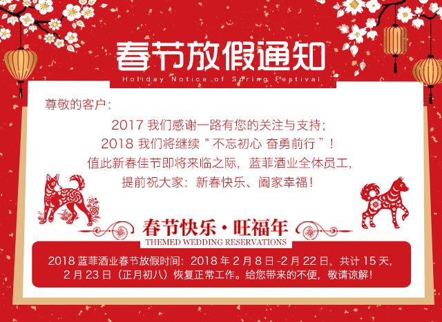 新年的鐘聲即將敲響,根據(jù)國(guó)家春節(jié)假期通知及藍(lán)菲公司的實(shí)際情況,確定于2018年2月9日-2月22日,共14天,為藍(lán)菲酒業(yè)春節(jié)假期,于2018年2月23日(正月初八)正式上班,請(qǐng)好朋友們悉知。同時(shí)在此提前恭祝,新春快樂!